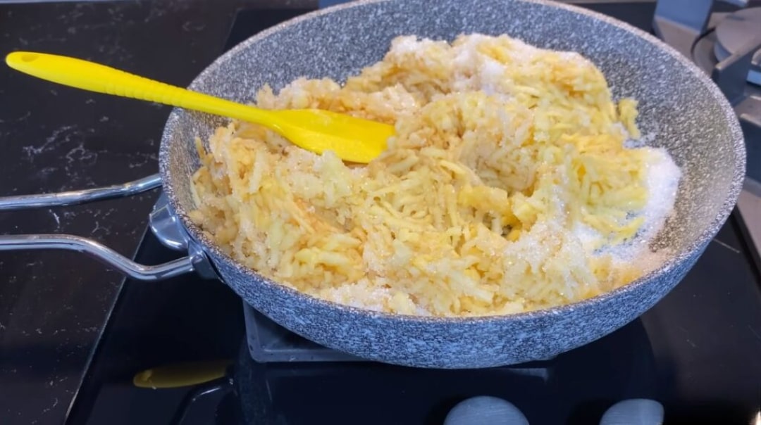 Elmaların kabuklarını soyduktan sonra rendeleyelim. Üzerine şeker ilave edip, elmalar suyunu salıp çekene kadar pişirelim. Pişirme işlemi tamamlandıktan sonra tarçını ekleyip güzelce karıştıralım.