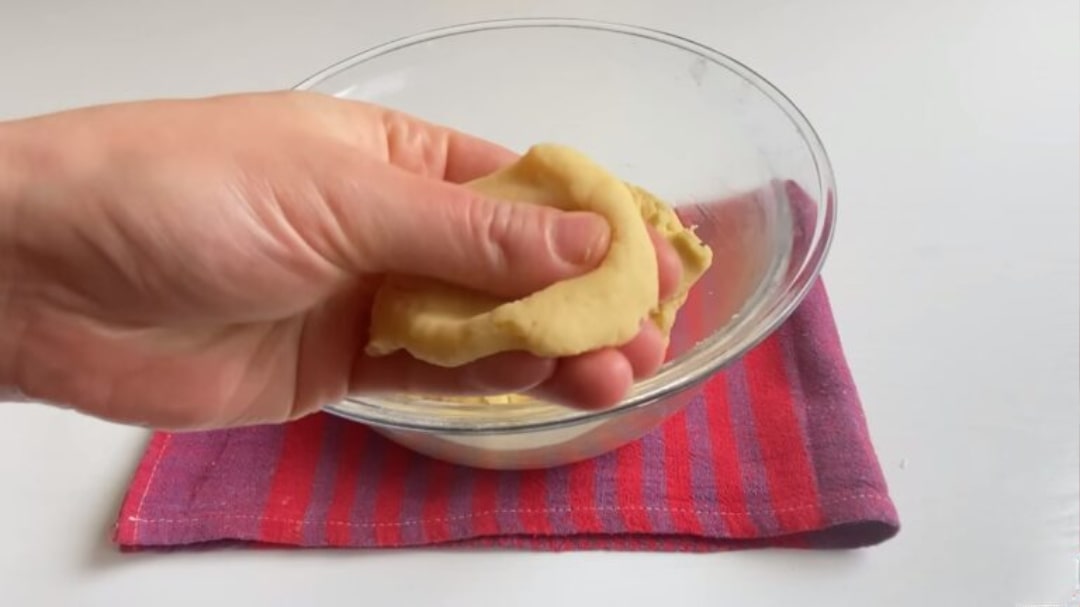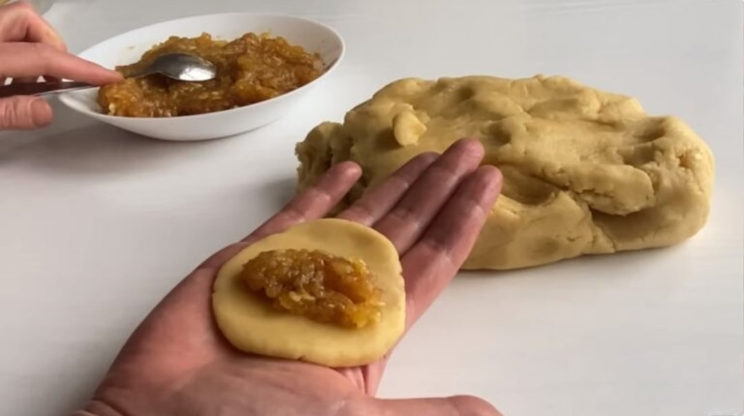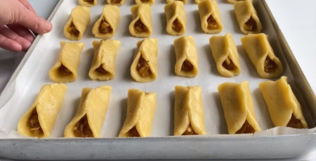 Hamurdan ceviz büyüklüğünde parçalar kopararak, üzerine bastırıp yassı hale getirelim. İç harcı ekledikten sonra iki ucunu birleştirip şekil verelim.