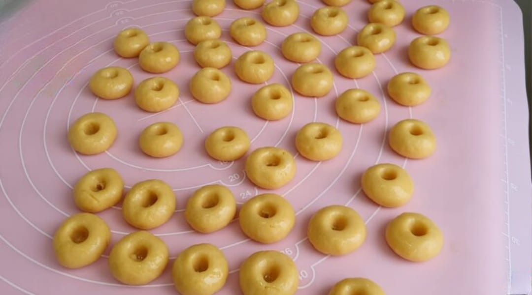 Ellerimizi sıvı yağ ile hafifçe yağladıktan sonra hamurdan ceviz büyüklüğünde parçalar alıp yuvarlayalım. Daha sonra hamurun ortasına serçe parmağımızla bastırarak küçük bir delik açalım.