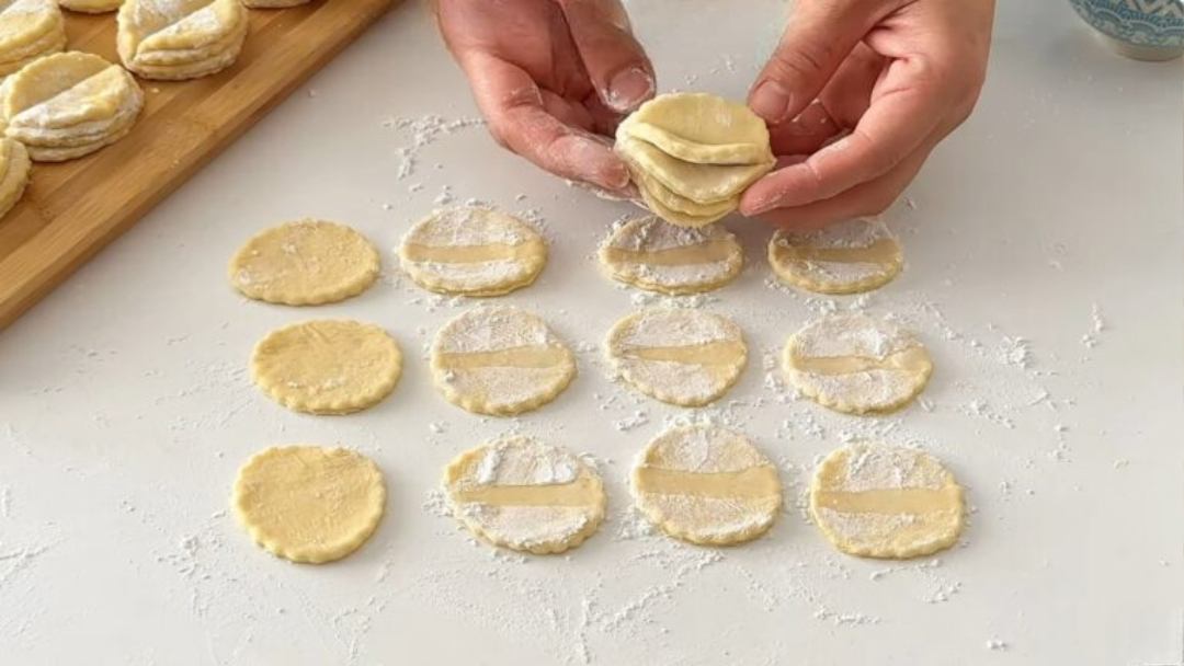 Hamurların üzerine nişasta serpiştirelim ve ortalarını suyla nemlendirelim. Dört hamuru üst üste koyup, ortalarına çubukla bastırarak şekillendirelim.