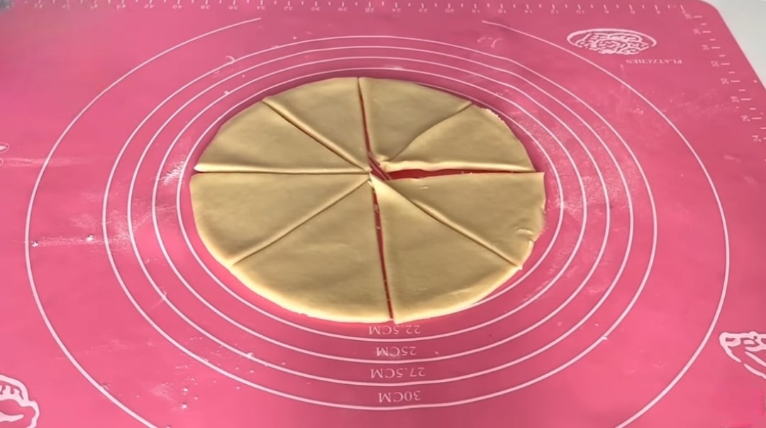 Un ve kabartma tozunu kontrollü bir şekilde ekleyerek yumuşak bir hamur yoğuralım. Hazırladığımız hamuru silindir şeklinde şekillendirip küçük bezelere ayıralım. Her bir bezeyi tatlı tabağı büyüklüğünde açalım. Daha sonra hamuru rulet yardımıyla 8 eşit üçgen parça olacak şekilde keselim.