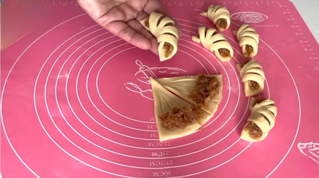 Her bir üçgen parçanın içine 3 çizik atarak iç harcı ekleyelim ve ardından rulo şeklinde saralım.