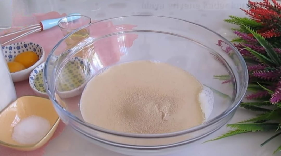 Yoğurma kabına sütü, mayayı ve şekeri ekleyerek güzelce karıştıralım.