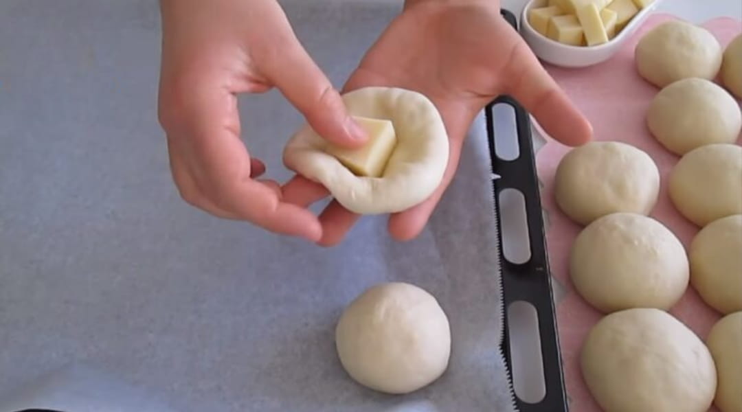 Bezeleri elimizle bastırarak biraz büyütelim, ardından kaşar peyniri ekleyip bohça gibi kapatarak yuvarlayalım.