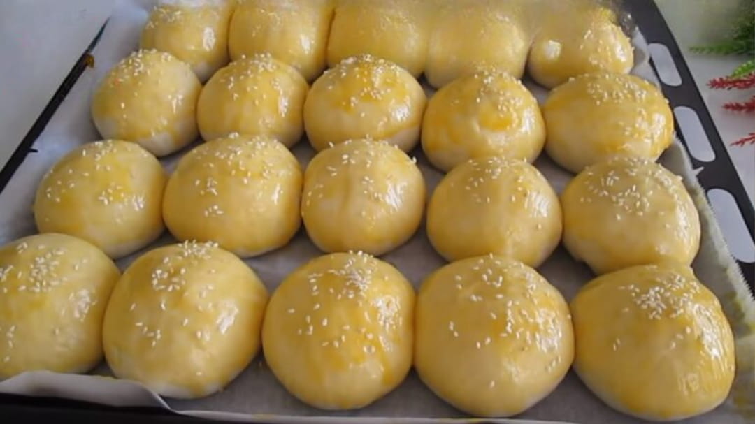 Şekil verdiğimiz poğaçaları, yağlı kağıt serili fırın tepsisine yerleştirelim. Üzerini bir örtü ile kapatıp yaklaşık 20 dakika dinlendirelim. Ardından, üzerlerine sıvı yağ ve yumurta sarısı karışımı sürerek susam serpiştirelim.