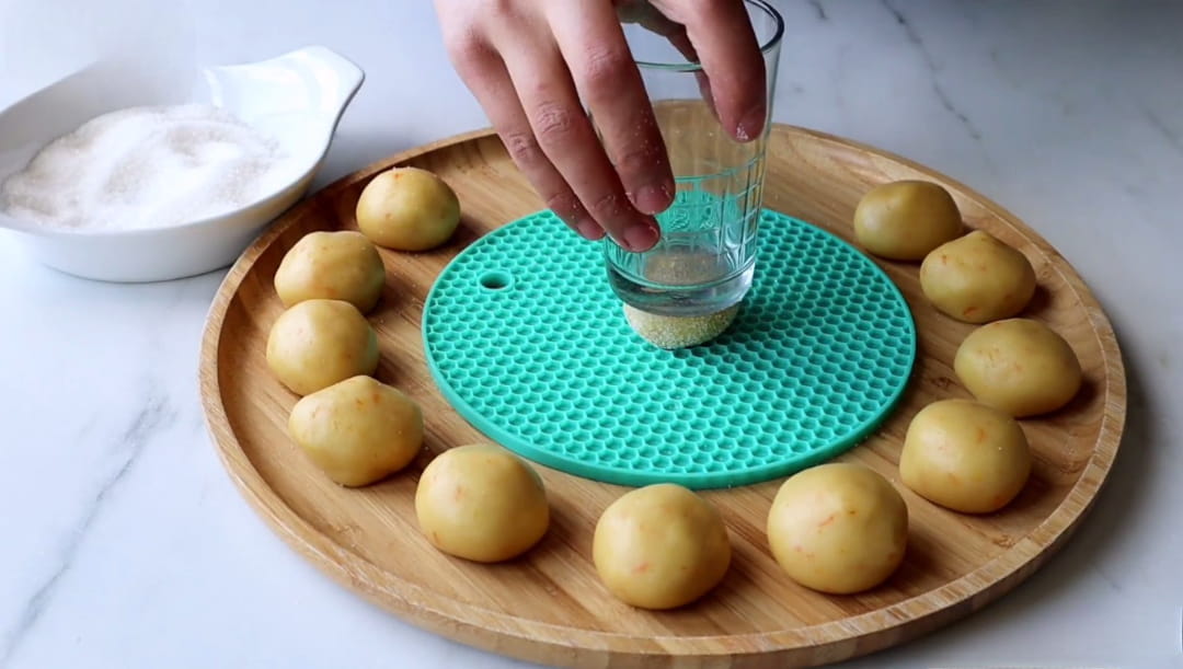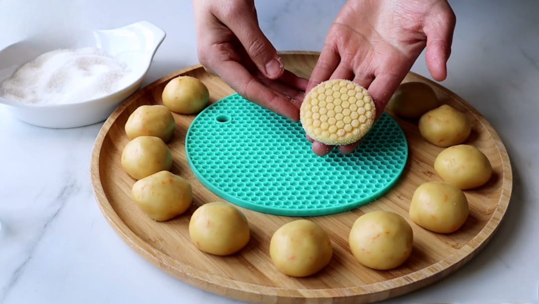 Hamurdan ceviz büyüklüğünde parçalar koparıp yuvarlayın ve toz şekere bulayın. Petek dokulu silikon bir aparatın üzerine hamuru koyup bardak altı ile hafifçe bastırıp çekerek o deseni verebilirsiniz